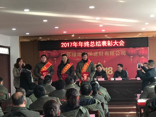 2月8日上午,江蘇綠地環保濾材有限公司在公司三樓會議室成功召開了2017年年終總結表彰大會。 會議首先由周金華廠長對全年2017年工作進行了回顧總結,北京公司劉總對2017年工作進行了點評,特邀代表大自然環保孫總做了重要講話。公司對現場投票產生了8名2017年度優秀員工、10年員工進行頒獎并合影。